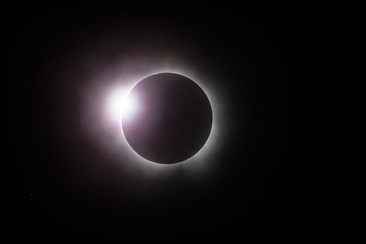 . . . this image (the lower one) has been slightly suppressed, resulting in a more refined look for the inner Corona and more detail in the visible prominences and ring effect. Both images were adjusted in Camera RAW by employing the dehaze feature, really necessary due to the prevailing cloud cover.