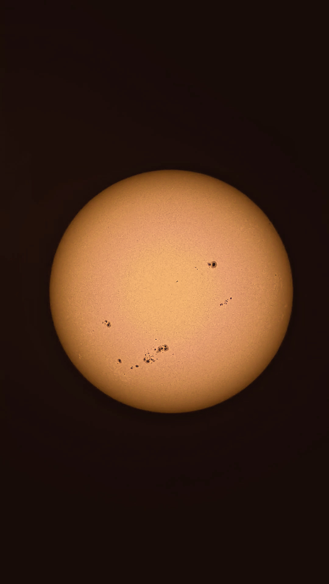 Solar photo -- early June, 2025 this image was shot with a more precise filter The Seestar comes with quite a fine Solar filter, however astro mythology suggests a more precise Baader filter, the industry standard. Such a filter renders the Sun quite white, so I ran the image through a simple coloring routine in Photoshop to produce this hopefully more pleasant shade. |