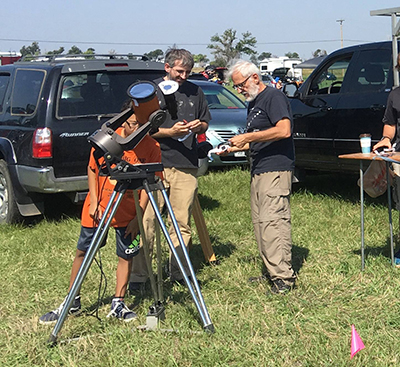 I always worry about the participants looking at the Sun during the potentially dangerous partial phases, but everyone here did well, especially the children. And near totality, I decided off-the-cuff to have Seth operate the Celestron C-5 visual telescope, while Larry and Jaci lined up the kids for a view. Due to Seth’s expertise, he successfully removed the filter and amazingly all eighteen of us got to look through the C-5 (this vintage ‘scope is absolutely outstanding –- it was the first time I used it) –- I got up during totality and nonchalantly walked over, asked if everyone had looked, and then peered through the C-5 myself before going back to the Megrez 'scope for more photographs and then the re-filtering of that photographic unit for the outgoing partial phases. |