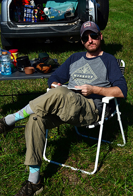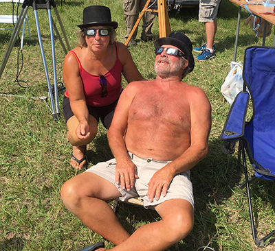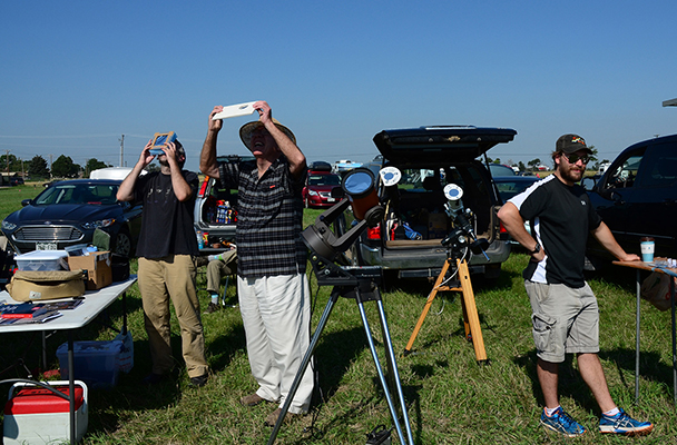 ![]() younger son Larry Greiner, good friend John Puntney, Millers' son Jerod Miller Note that everyone observing the Sun's partial stages is using filters -- also note that to John's left are the two filtered telescopes used -- to John's immediate left is the Celestron visual unit with metal tripod; behind (with the wood tripod) is the Megrez photographic 'scope. |