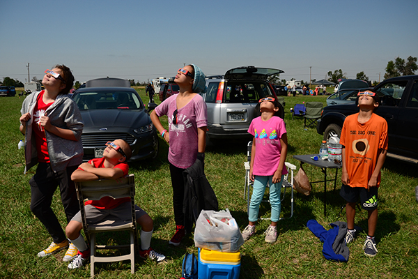 dateline August, 2017 -- "A Family Affair" -- Larry and Jaci Greiner's family consisting of: Tiffani Bell, Timothy Julian (seated), AnnaMarie McClain, Ilona Greiner and Charles Greiner (wearing 1991 "The Big One" tee shirt); all sporting safe eclipse-viewing glasses. -- lwg |
