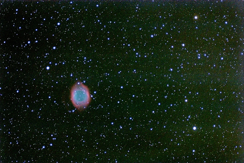 Image obtained 10-11/12-2015 through RVO's Megrez 80mm refractor with Orion field-flattener lens, using a Baader-modified Canon XSi DSLR and BackyardEOS image-acquisition software – 9 (of 23 obtained) carefully selected and stacked 360-second luminance frames combined with multiple dark, flat and bias calibration frames shot at ISO 1600 and totaling more than 360 minutes (54 minutes effective luminance) were used to create this image; optics driven by the Losmandy G-11 mount equipped with Ovision's precision RA worm gear, guided with an Orion SSG3 Monochrome CCD camera using Maxim DL Pro and post-processed with DeepSkyStacker and Photoshop CS3. From the web: "At magnitude +7.3 the Helix Nebula is the brightest planetary nebula in the sky. Based just on this information it would seem an easy target and indeed it is visible with just binoculars at a dark site on a moonless evening. But that is the key; dark skies are required. This is due to its large surface area resulting in a low surface brightness. At its widest point the main nebula covers 18 arc minutes with the much fainter outer halo spanning some 28 arc minutes – close to the diameter of the full Moon. The low surface brightness meant that Charles Messier failed to spot it. Even the two great astronomers, Sir William and Sir John Herschel, failed to notice it during their sky searches until German astronomer Karl Ludwig Harding eventually discovered it sometime before 1824. When viewed through a pair of 10x50 binoculars the Helix Nebula appears as a faint featureless oval shaped disk. A 100mm (4-inch) telescope reveals finer structural details. Through a 200mm (8-inch) telescope the Helix Nebula appears as a slightly large oval ring with two thick arcs, gaps and variations of brightness visible across the structure. A Nebula filter of the UHC (Ultra High Contrast) or OIII (Oxygen III) variety especially when combined with averted vision helps bring out more subtle details. However it's an illusive object that can be rendered invisible even in medium sized amateur telescopes with just a small amount of light pollution. The central star of the Helix Nebula is of magnitude +13.4 and therefore only easily visible in the largest of amateur telescopes. The Helix Nebula is located only 695 light-years from Earth and has an actual radius of about 3 light-years. It's the brightest planetary nebula and marginally brighter than M27 the famous Dumbbell Nebula. However, it's a much more elusive target due to its low surface brightness. When imaged or photographed the Helix Nebula looks spectacular, beautifully colourful with twists, coils, knots and rings of gas. It's a popular object on astronomer's observational lists.”